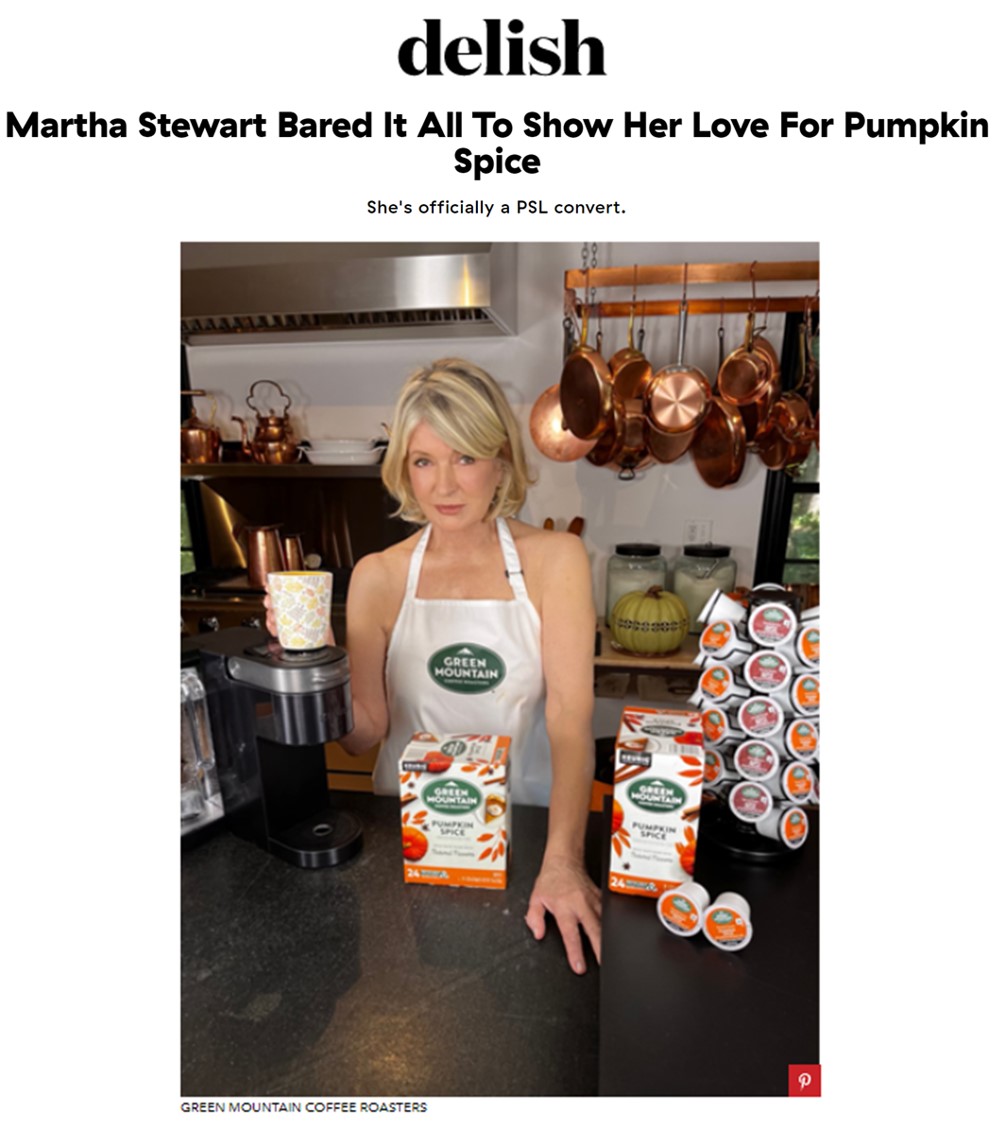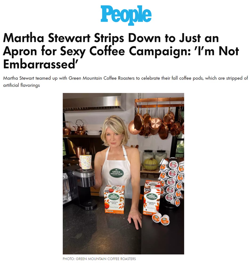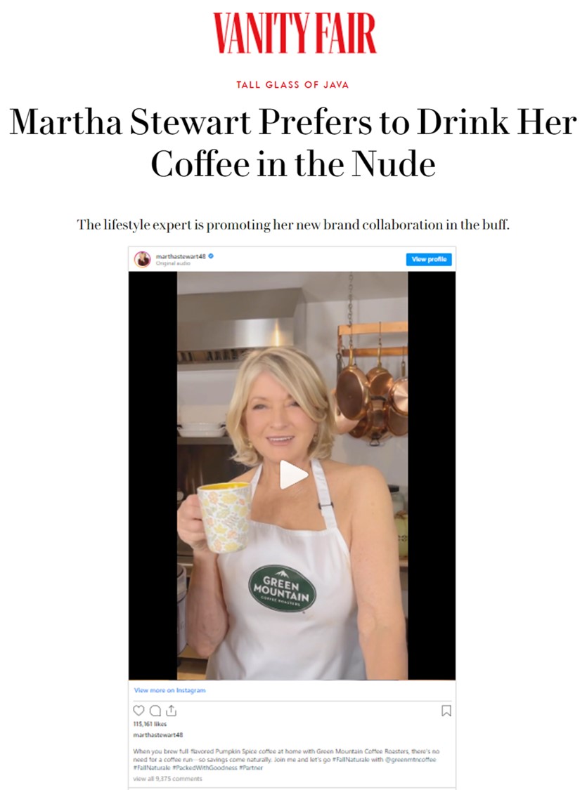 The media impact was unparalleled and far out-performed our earned media goals, garnering billions of impressions, and ended up as Martha's most viewed IG video. It boosted awareness of GMCR's natural flavors, and bolstered Martha’s brand as she was celebrated for her unflinching confidence and wit.