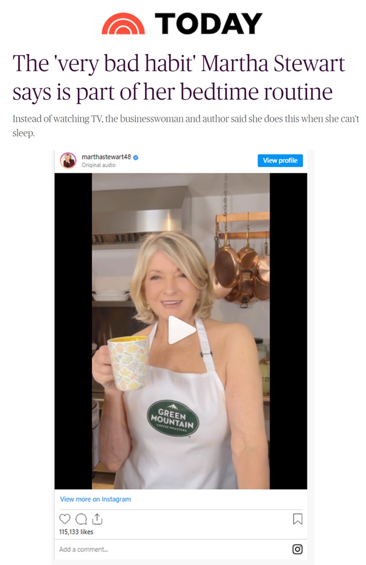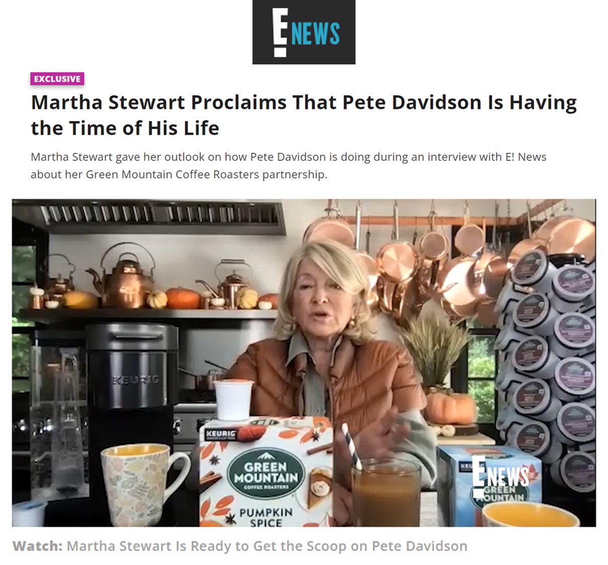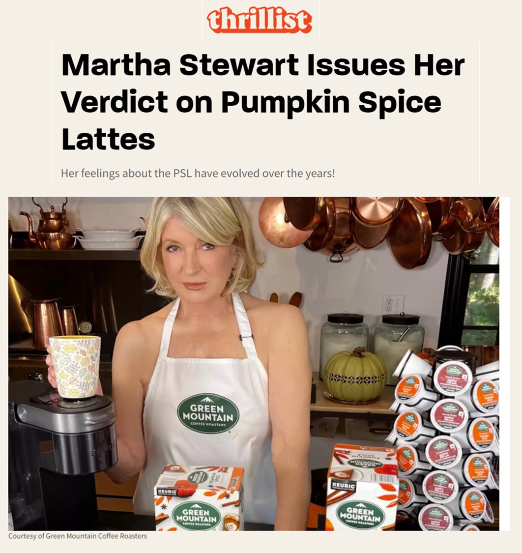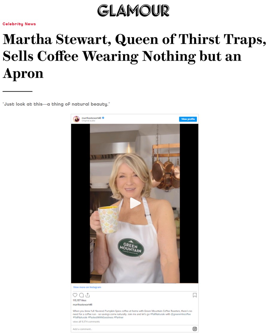 The media impact was unparalleled and far out-performed our earned media goals, garnering billions of impressions, and ended up as Martha's most viewed IG video. It boosted awareness of GMCR's natural flavors, and bolstered Martha’s brand as she was celebrated for her unflinching confidence and wit.